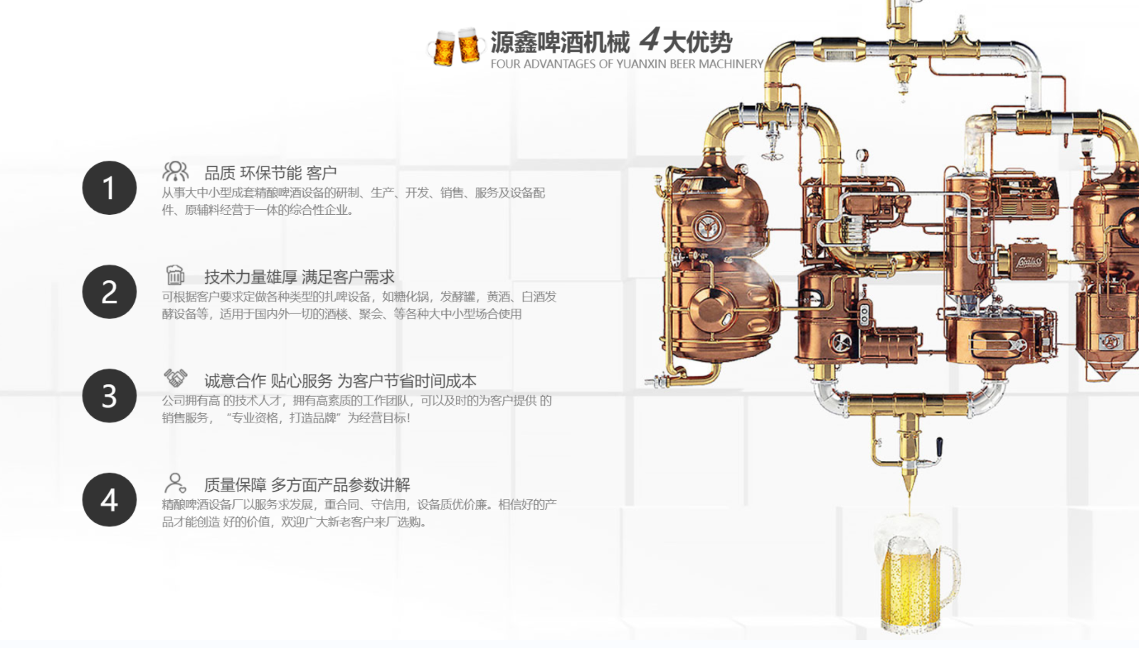南陽(yáng)市源鑫啤酒機(jī)械設(shè)備有限公司位于歷史文化名城一-南陽(yáng),從事大中小型成套啤酒、白酒自釀設(shè)備的研制、生產(chǎn)、開發(fā)、銷售、服務(wù)及設(shè)備配件、原輔料經(jīng)營(yíng)于一體的綜合性企業(yè)。公司可根據(jù)客戶要求定做各種類型的扎啤設(shè)備,如糖化鍋,發(fā)酵罐,黃酒、白酒發(fā)酵設(shè)備等,適用于國(guó)內(nèi)外一切的酒樓、餐廳、家庭.聚會(huì)、酒吧等各種大、中、小型場(chǎng)合使用。公司擁有技術(shù)人才,擁有高素質(zhì)的工作團(tuán)隊(duì),可以及時(shí)的為客戶提供**的銷售服務(wù)。公司以“專業(yè)資格,打造品牌”為經(jīng)營(yíng)目標(biāo),“卓越質(zhì)量,信賴價(jià)格”為經(jīng)營(yíng)宗旨,以質(zhì)量求生存,以服務(wù)求發(fā)展,重合同、守信用,設(shè)備質(zhì)優(yōu)價(jià)廉。相信好的產(chǎn)品才能創(chuàng)造 好的價(jià)值,歡迎廣大新老客戶來(lái)廠選購(gòu)。...